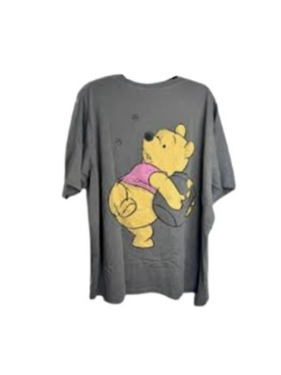 Camiseta gris oscuro con estampado grande de Winnie the Pooh en la parte frontal. Diseño relajado tipo oversize, tela suave y cómoda, ideal para uso casual o descanso.