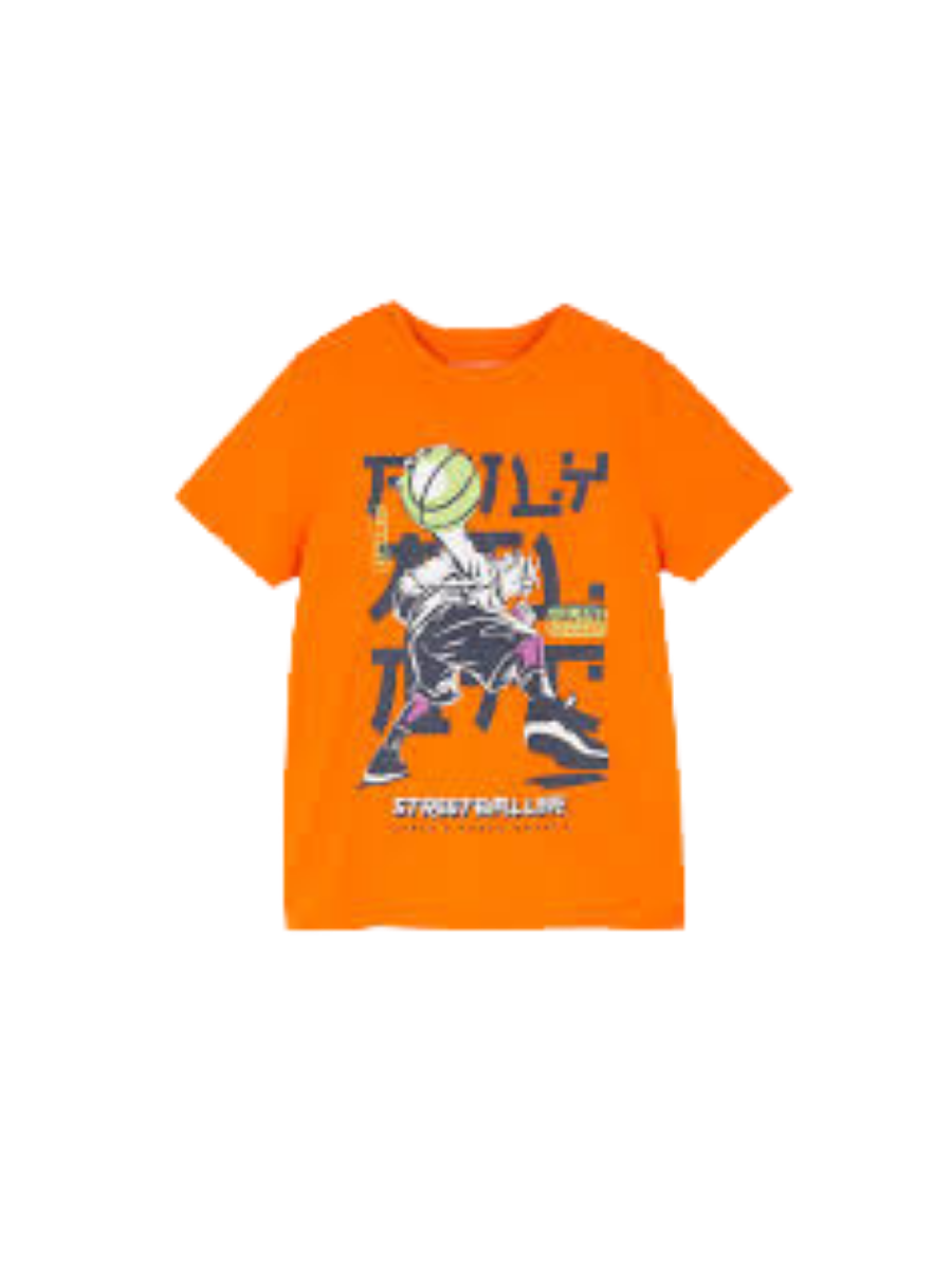 Camiseta color naranja con estampado frontal de jugador de baloncesto y texto “STREET BALL LINE”. Tela ligera, fresca y cómoda, ideal para uso diario o actividades deportivas.
