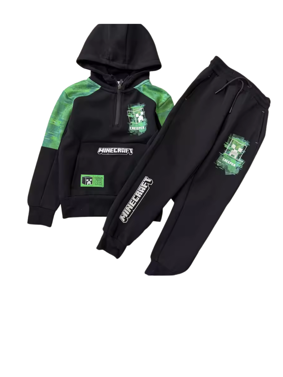 Conjunto color negro con detalles en verde inspirado en Minecraft. Incluye buzo con capucha y cierre parcial al frente, más pantalón tipo jogger con estampado del personaje Creeper. Tela suave, cálida y cómoda. Ideal para los pequeños fans del videojuego.