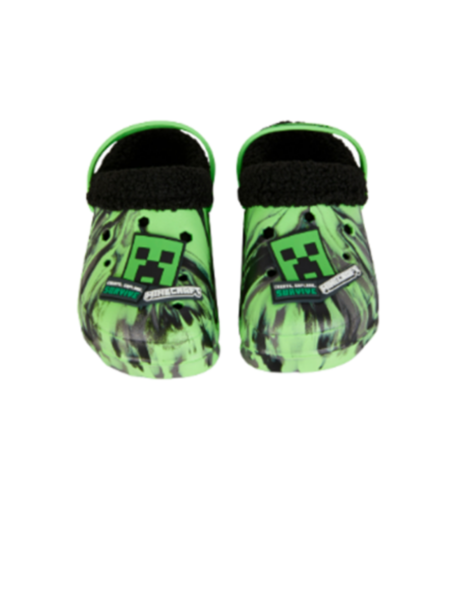 Zuecos tipo Crocs inspirados en el universo de Minecraft, con diseño verde estilo “Creeper” y un patrón dinámico en tonos negro y neón. Incluyen pines decorativos oficiales y forro interior afelpado, ideal para mayor comodidad y calidez.